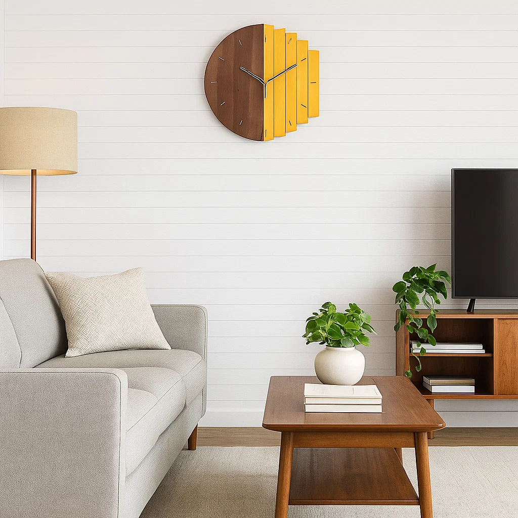 Dimensioni: 30 x 30 cm Materiale: Legno sostenibile Colori disponibili: Nero, Giallo, Bianco Meccanismo: Movimento al quarzo per una misurazione precisa del tempo